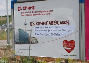 Meine grundsätzlich theologisch und politisch konservative Grundeinstellung ließ mich lange zögern und Zurückhaltung üben gegenüber „Stuttgart 21“, wiewohl ich schon lange begründet gegen dieses Projekt bin. Die offensichtlich abhanden gekommene Basisverhaftung und Ignoranz dieser durch die Befürworter: Bahn, Politik und Wirtschaft, deren stures Festhalten an einem Projekt, das in der breiten Bevölkerung keine Mehrheit findet und die Unwilligkeit auf die Gegenseite überhaupt zu hören, die Gesprächsverweigerung gegenüber einer breiten bürgerlichen Bewegung und die Etikettierung als „Berufsdemonstranten“, dazu ein massiver Polizeieinsatz mit völlig unverhältnismäßigen Mitteln gegen Demonstranten im Schlossgarten, auch gegen minderjährige Schüler und alte Menschen, was alles eines demokratischen Rechtsstaates unwürdig ist, ließen mich umdenken, ohne damit meine grundsätzlich konservative Grundhaltung aufzugeben. Für meine Begriffe bedeutet die Durchführung des Projekts „Stuttgart 21“, allem Anschein nach jetzt nach dem Motto: „Augen zu und durch“, was politisches Versagen markiert: Architekturzerstörung, Demokratiegefährdung, Geologiemissachtung, Geldverschwendung, Ökologiezerstörung, Ökonomiebesessenheit, (Verkehrs)Unsicherheit, Unwirtschaftlichkeit.