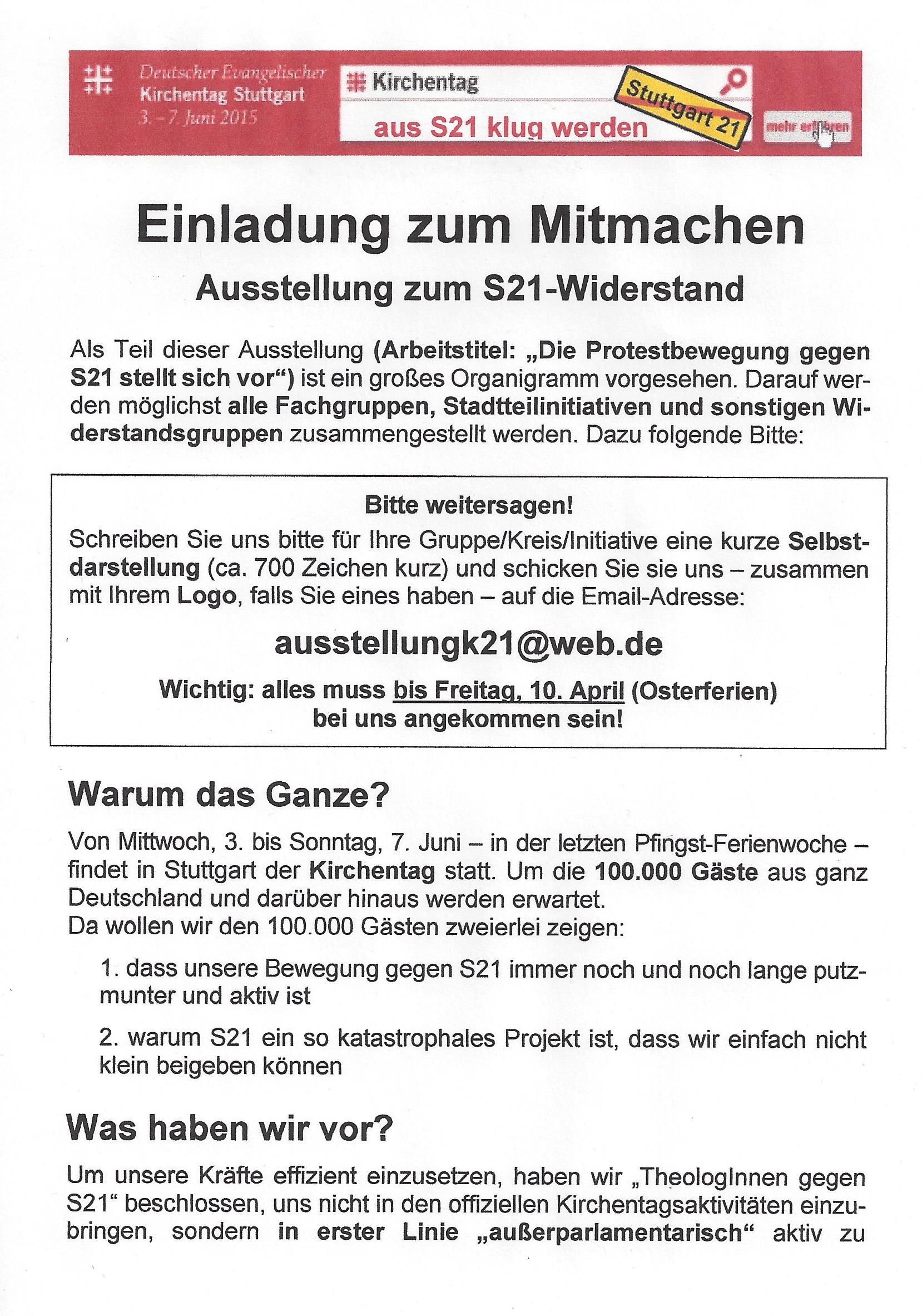 Von Mittwoch, 3. Juni bis Sonntag, 7. Juni findet in Stuttgart der „35. Deutsche Evangelische Kirchentag“ statt. Hier, unter der neuen Rubrik „Kirchentag21“ werden wir in nächster Zeit Informationen rund um den Kirchentag einstellen – vor allem, um öffentlich zu machen, was für den Kirchentag vonseiten der S21-GegnerInnen geplant ist (und bereits öffentlich werden soll :-)). Besuchen Sie also gerne diese Seite gelegentlich wieder und sehen Sie, ob und was sich tut im Hinblick auf den Kirchentag.